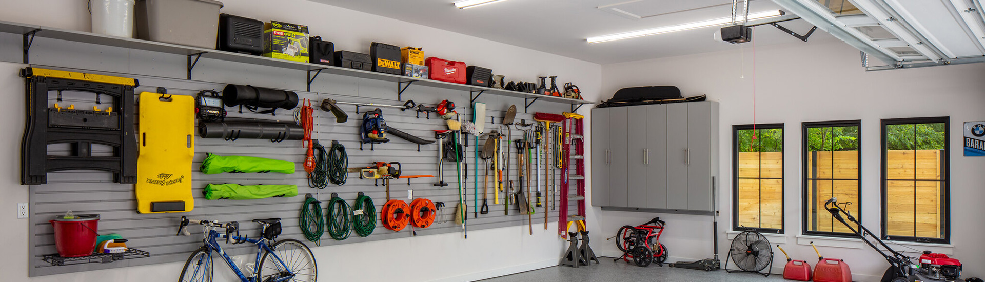 Garajes: guarde sus herramientas eléctricas, escaleras y equipos de temporada en los estantes superiores, mientras que los artículos más pequeños, como herramientas de jardinería y artículos de limpieza, pueden colgar de los ganchos.